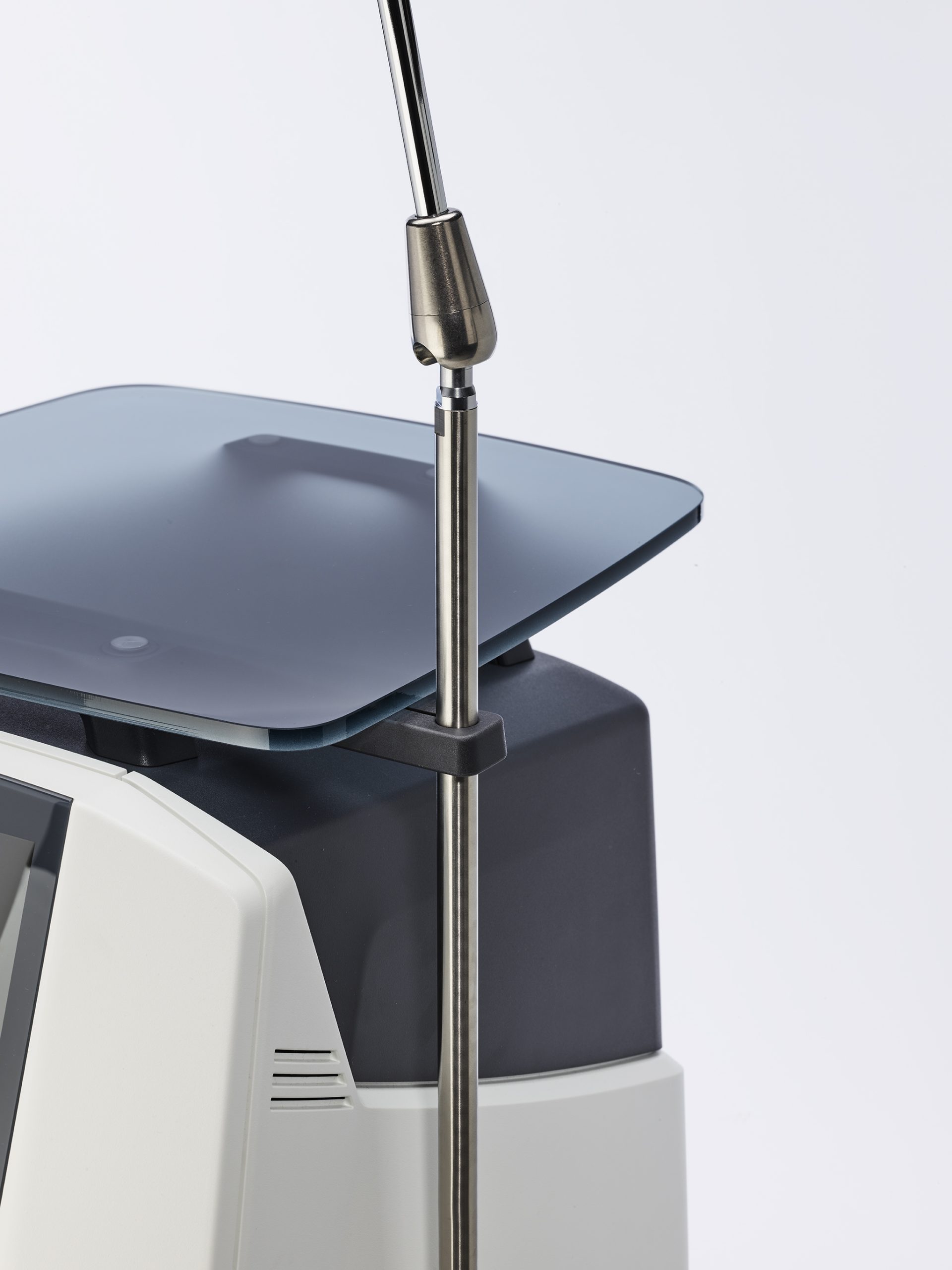 Opcjonalne ramię podtrzymujące ułatwia obsługę bez użycia rąk, zwłaszcza podczas długich zabiegów. Strumień powietrza może być łatwo kontrolowany przez użytkownika. Praktyczna szklana półka doskonale nadaje się jako wsparcie do dodatkowego urządzenia.