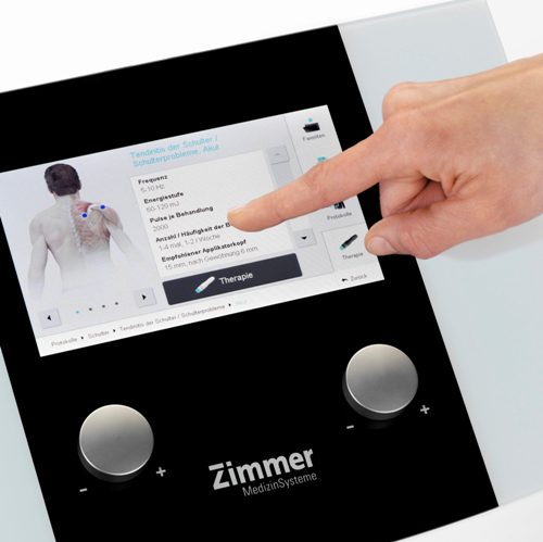 Duży kolorowy ekran dotykowy z możliwością obsługi za pomocą opuszka palca. Bezpośredni dostęp do wszystkich niezbędnych parametrów terapeutycznych, łącznie z listą wskazań ze wskazówkami pomocniczymi i dużą pamięcią do programów dostosowanych indywidualnie. Preselekcja protokołów terapeutycznych do wskazań głównych z obszerną funkcją pomocy, łącznie z przedstawieniem graficznym obszaru poddawanego zabiegowi. Solidny ergonomiczny uchwyt aluminiowy o dużej bezwładności zapewnia optymalny transfer energii skierowany na pacjenta i perfekcyjną ochronę terapeuty przed wibracjami. Dostępne są nasadki aplikatora o różnych rozmiarach i kształtach. Szybka zmiana nasadek bez użycia narzędzi umożliwia optymalne stosowanie terapii.